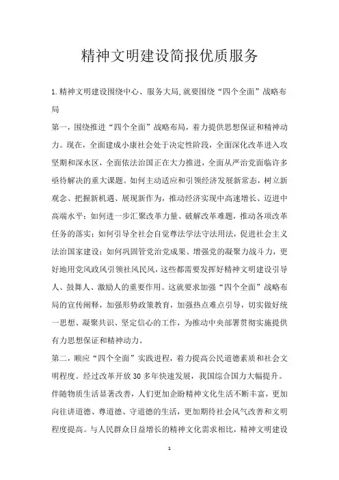 精神文明建设简报优质服务1.精神文明建设围绕中心、服务大局,就要围绕“四个全面”战略布局第一,围绕推进“四个全面”战略布局,着力提供思想保证和精神动力。