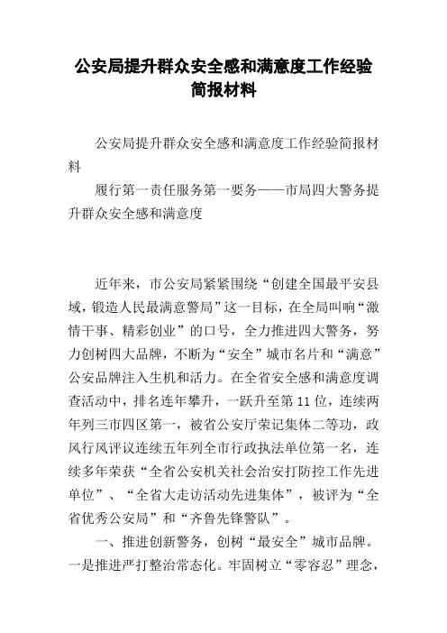 公安局提升群众安全感和满意度工作经验简报材料公安局提升群众安全感和满意度工作经验简报材料履行第一责任服务第一要务——市局四大警务提升群众安全感和满意度近年来,市公安局紧紧围绕“创建全国最平安县域,锻造人民最满意警局”这一目标,在全局叫响“激情干事、精彩创业”的口号,全力推进四大警务,努力创树四大品牌,不断为“安全”城市名片和“满意”公安品牌注入生机和活力。