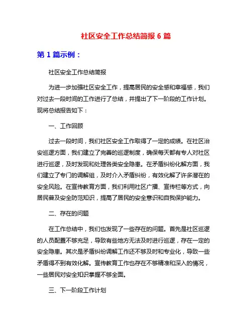 社区安全工作总结简报6篇第1篇示例:社区安全工作总结简报为进一步加强社区安全工作,提高居民的安全感和幸福感,我们对过去一段时间的工作进行了总结,并提出了下一阶段的工作计划。