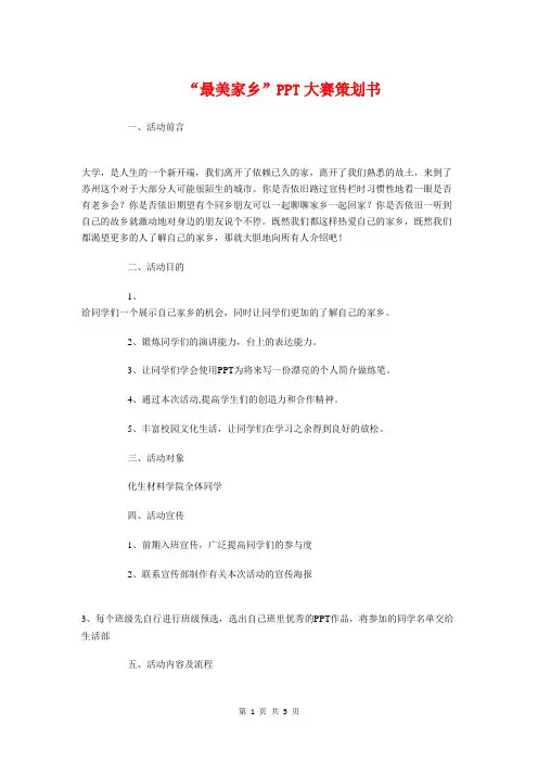 三、活动对象化生材料学院全体同学四、活动宣传1、前期入班宣传,广泛提高同学们的参与度2、联系宣传部制作有关本次活动的宣传海报3、每个班级先自行进行班级预选,选出自己班里优秀的PPT作品,将参加的同学名单交给生活部五、活动内容及流程1、活动内容由2-4人一组,制作一个PPT,展示自己的家乡。