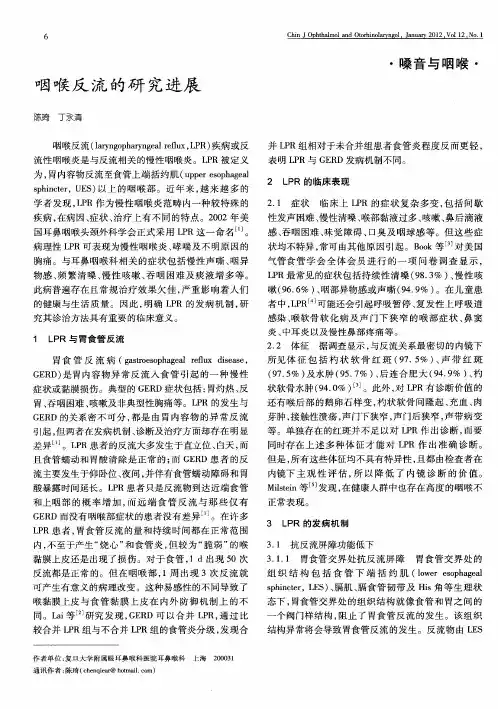 咽喉反流作者:刘桂苹来源:《赤峰学院学报·自然科学版》 2012年第4期刘桂苹(赤峰市第二医院耳鼻喉科,内蒙赤峰 024000)摘要:咽喉反流为胃内容物反流至上食管括约肌以上的咽喉部,病理性咽喉反流可表现为慢性咽喉炎、发音障碍、咳嗽、哮喘等,相应症状为:清喉动作、慢性咳嗽、咽喉异物感、吞咽困难、喉痛等,咽喉反流与胃食管反流存在较多的不同之处,本文重点介绍咽喉反流概念,诊断,在耳鼻喉的表现及其治疗.关键词:咽喉反流;胃食管反流中图分类号:R766.5 文献标识码:A 文章编号:1673-260X(2012)02-0025-021 概念对于胃食管反流性疾病,我们并不陌生,胃食管反流为胃内容物通过食道括约肌反流入食道,大量反流可引起以反酸、烧心、吞咽困难等为特征的胃食管反流性疾病,但咽喉反流性疾病逐渐被人们所认知,咽喉反流为胃内容物反流至上食管括约肌以上的咽喉部,是由于咽喉部粘膜缺少针对胃酸-胃蛋白酶的抗反酸机制,导致与胃酸接触的粘膜表面损伤,这种病变程度与反流物的成分、反流频率以及持续时间有关.2 临床表现1.反流性咽喉炎以声音嘶哑、发音疲劳和双音为特点的发音障碍,其它咽喉反流的症状包括:慢性清嗓动作、慢性咳嗽、咽部异物感、吞咽困难、喉痛、不明原因胸痛.2.与反流有关的病变为:慢性咽喉炎、声带息肉、声带小结、声带接触性肉芽肿和溃疡、声带任克水肿、声门下狭窄、杓状软骨固定、喉软骨软化、部分喉癌患者、阵发性喉痉挛、哮喘、鼻窦炎等.3.患者体征包括:(1)声门后联合区域红斑、水肿,长期反流的患者中可出现杓间或后联合区域粘膜肥厚、增生.(2)声带肉芽肿或溃疡.(3)声带血管水肿扩张.(4)假性声带沟为弥漫性声门下水肿的表现.(5)双侧杓状软骨粘膜红斑和水肿.3 诊断1964年Miller等人首先提出在体内留置PH管以监测胃酸分泌,这种方法不断改进,成为目前诊断反流行疾病最可靠方法,只有同时符合以下四项才能称一次咽喉反流:(1)PH值下降至<4并持续5秒以上;(2)咽喉部PH值下降与远端PH值同时发生,或在其发生以后立即出现,且咽喉部最低值大于远端处的最低值;(3)PH值下降不是在进食或吞咽时发生;(4)咽喉部PH值下降是快速的,而不是逐渐的.病理性咽喉反流诊断标准为24h内总反流次数超过6.9次以上.4 食管反流与咽喉反流的区别多年来研究认为,咽喉反流与胃食管反流有明显不同,下列表显示在二者的症状、体征、辅助检查以及治疗等方面的差别.5 治疗在治疗上,首先建议改变生活方式:(1)睡前3或4小时不饮食水,(2)餐后至少等待2小时后躺卧,(3)床头抬高睡眠,(4)减少高脂肪食物,避免过饱用餐,(5)戒除烟酒、咖啡、巧克力等可能增加反流的食物,(6)饮料的限制,(7)减肥、减轻心理压力等,其次药物治疗:质子泵抑制剂为目前一线用药,开始标准剂量或加倍剂量2-3月后症状得到控制可减少用量,奥美拉唑每天两次,每次20-40mg;兰索拉唑每天两次,每次30mg,给药时间为早饭前和晚饭前,有利于药物吸收,如2-3个月后症状明显改善可减量为每天一次或隔日一次,维持治疗最少6个月,如2-3个月后症状改善不明显可加倍给药,治疗4个月仍无效可换用不同品牌质子泵抑制剂药物.6 总结作为一个耳鼻喉科医师,如能增强对咽喉反流的认识,就能对临床许多慢性咳嗽、声嘶、咽喉异物感等做出正确的诊疗方向.参考文献:〔1〕Miller FA,Dovale J,Gunther T.Utilization of inlying pH probe forevaluation of acidpeptic diathesis.Arch Surg,1964,89:199-203.〔2〕窦齐,周康年.反流性咽喉炎与胃食管反流病的关系研究.临床耳鼻咽喉科杂志,2001(15):548-549.〔3〕王晓巍,倪道凤.胃食管反流与慢性咽喉炎.中华耳鼻咽喉科杂志,2004(39):55-58.。