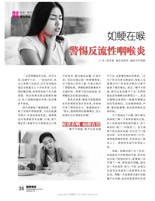 解析慢性咽喉炎与反流性病症的联系慢性咽喉炎与反流性疾病的关联解析慢性咽喉炎(chronic pharyngitis)是指咽喉黏膜长期受到炎症刺激,出现慢性炎症反应的病症。