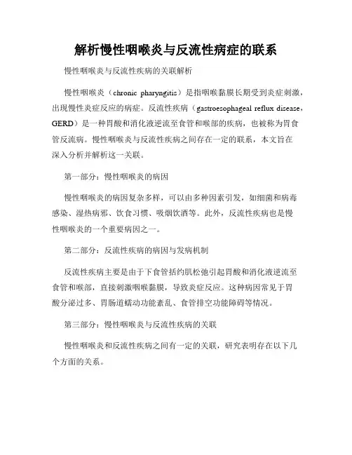 第三部分:慢性咽喉炎与反流性疾病的关联慢性咽喉炎和反流性疾病之间有一定的关联,研究表明存在以下几个方面的关系。