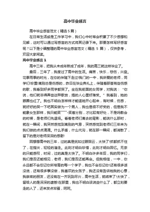 高中毕业感言(精选20篇)高中毕业感言(精选20篇)在平日的学习、工作和生活里,我们常常会对人或者事物有新的思考,这时就可以将其写成一篇感言,让自己铭记于心。