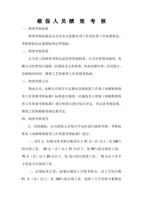 四、绩效考核奖罚1、内部抽检:公司质检人员每月不定时进行抽查考核,考核标准见《电梯维修保养工作质量考核标准》进行:一、责任人:如果月度考核分数责任人95分(含)以上,发100%的月绩工资;80分(含)以上95分以下,发90%的月绩效工资;70分(含)以上80分以下,发70%的月绩效工资;70分以下者不予发放当月绩效工资。