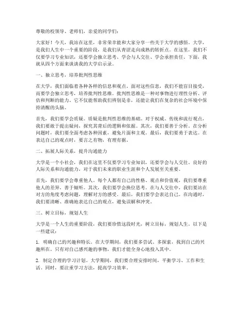 尊敬的校领导、老师们,亲爱的同学们:大家好!今天,我站在这里,非常荣幸能和大家分享一些关于大学的感悟。