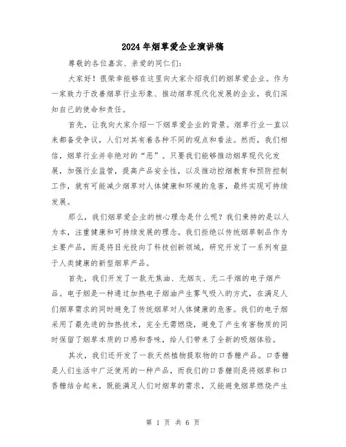 2024年烟草爱企业演讲稿尊敬的各位嘉宾、亲爱的同仁们:大家好!很荣幸能够在这里向大家介绍我们的烟草爱企业。