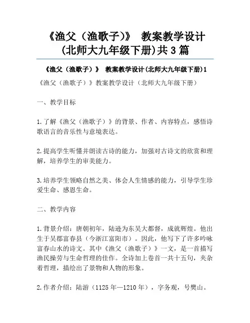 《渔父(渔歌子)》教案教学设计(北师大九年级下册)共3篇《渔父(渔歌子)》教案教学设计(北师大九年级下册)1《渔父(渔歌子)》教案教学设计(北师大九年级下册)一、教学目标1.了解《渔父(渔歌子)》的背景、作者、内容特点,感悟诗歌语言的音乐性与意境表达。