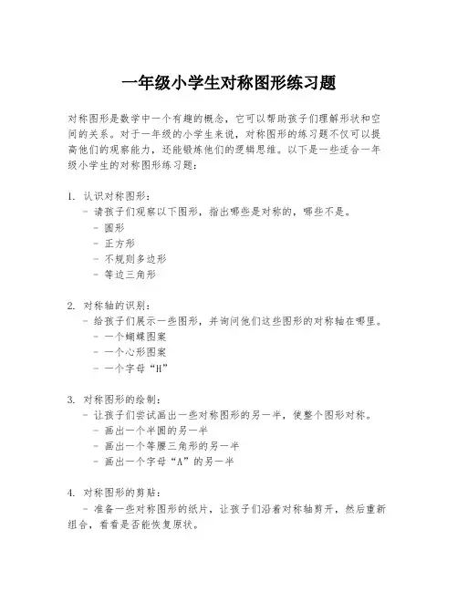 以下是一些适合一年级小学生的对称图形练习题:1. 认识对称图形:- 请孩子们观察以下图形,指出哪些是对称的,哪些不是。