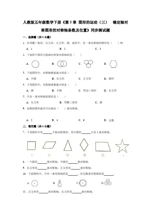 人教版五年级数学下册《第5章图形的运动(三)确定轴对称图形的对称轴条数及位置》同步测试题一.选择题(共6小题)1.在等腰三角形、长方形、正方形、圆、扇形中,有一条对称轴的图形有()种.A.1B.2C.32.下面四个图形只能画出两条对称轴的是()A.B.C.D.3.下面图形中,对称轴数量最少的是()A.半圆B.长方形C.正方形D.圆环4.下列图形中,对称轴条数最少的是()A.圆B.半圆C.等边三角形D.长方形5.只有一条对称轴的图形是()A.长方形B.等腰三角形C.圆6.如图的图形最多可以画出()条对称轴.A.2B.4C.6D.无数二.填空题(共6小题)7.下列图形中有个轴对称图形,其中图形只有1条对称轴.8.一个圆有条对称轴,半圆有条对称轴.9.长方形有条对称轴,正方形有条对称轴.10.下面图形中,只有一条对称轴的是,有无数条对称轴的是.11.正方形有条对称轴,长方形有条对称轴.12.正三角形有条对称轴,它的各个角都是o.三.判断题(共5小题)13.圆是轴对称图形,有无数条对称轴,每条对称轴都过圆心.(判断对错)14.等边三角形和长方形的对称轴条数相等.(判断对错)15.正五角星是一个轴对称图形,它有5条对称轴.(判断对错)16.一个圆的直径是这个圆的一条对称轴。