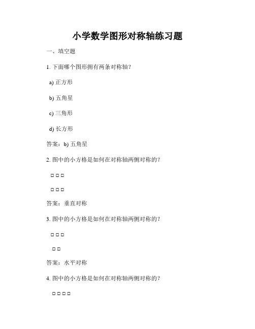 小学数学图形对称轴练习题一、填空题1. 下面哪个图形拥有两条对称轴?a) 正方形b) 五角星c) 三角形d) 长方形答案:b) 五角星2. 图中的小方格是如何在对称轴两侧对称的?□ □ □□ □ □答案:垂直对称3. 图中的小方格是如何在对称轴两侧对称的?□ □ □□ □答案:水平对称4. 图中的小方格是如何在对称轴两侧对称的?□ □ □ □□ □ □ □ □□ □ □ □答案:垂直和水平对称二、选择题1. 下图中的对称轴是哪条线?a) 线ABb) 线BCc) 线AC答案:c) 线AC2. 下图中有几条对称轴?a) 1b) 2c) 3答案:a) 1三、判断题1. 正方形拥有两条对称轴。