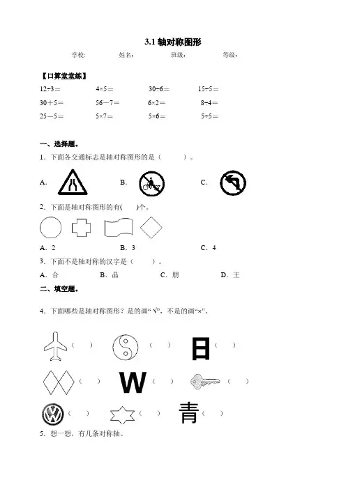 A 、B、 c8、图中的图形中是常见的安全标记,其中是轴对称图形的是( )9、找出下面图形中是轴对称图形,并且有两条对称轴的是()A.B.C.D.三、操作题:1、下列图形是轴对称图形吗?如果是,分别画出它们的对称轴。