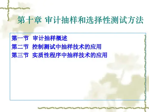 审计测试中的抽样技术第十章审计测试中的抽样技术一、大纲(一)审计抽样概述(二)控制测试中抽样技术的运用(三)实质性测试中抽样技术的运用二、本章重点、难点(一)审计抽样概述1. 审计抽样的定义(1)审计抽样的概念。