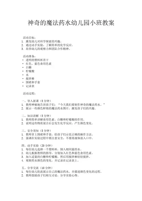教学内容:1. 介绍魔法水a. 魔法水的定义和特点b. 魔法水实现的原理c. 魔法水的应用场景2. 制作魔法水的过程a. 准备所需材料b. 操作步骤介绍c. 魔法水制作的注意事项教学过程:1. 魔法水的介绍(1)引入主题:神奇的魔法水(2)让幼儿发表关于魔法的想法。
