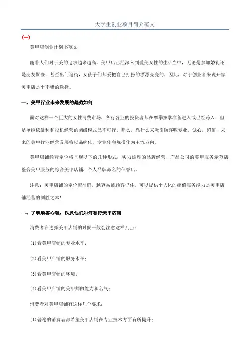 大学生创业项目简介范文(一)美甲店创业计划书范文随着人们对于美的追求越来越高,美甲店已经深入到爱美女性的生活当中,无论是参加婚礼还是朋友聚餐,甚至出门逛街,女孩子们都爱把自己打扮的漂漂亮亮的,因此,对于创业者来说开家美甲店是个不错的选择。