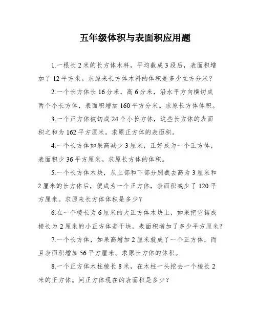 五年级体积与表面积应用题1.一根长2米的长方体木料,平均截成3段后,表面积增加了12平方米。
