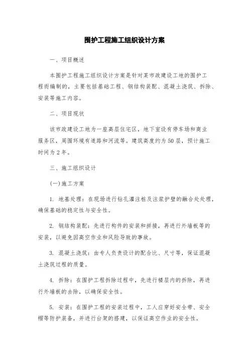 围护工程施工方案一、工程概况本项目为XXX工程,位于XXX地区,主要包括XXX栋建筑物、XXX配套设施等。