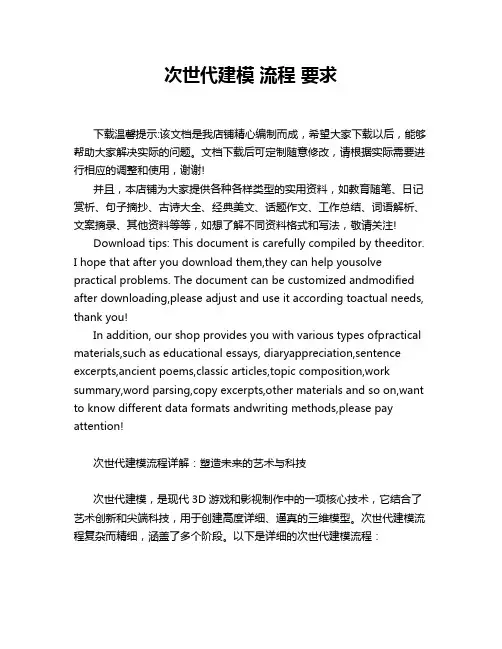 文档下载后可定制随意修改,请根据实际需要进行相应的调整和使用,谢谢!并且,本店铺为大家提供各种各样类型的实用资料,如教育随笔、日记赏析、句子摘抄、古诗大全、经典美文、话题作文、工作总结、词语解析、文案摘录、其他资料等等,如想了解不同资料格式和写法,敬请关注!Download tips: This document is carefully compiled by theeditor.I hope that after you download them,they can help yousolve practical problems. The document can be customized andmodified after downloading,please adjust and use it according toactual needs, thank you!In addition, our shop provides you with various types ofpractical materials,such as educational essays, diaryappreciation,sentence excerpts,ancient poems,classic articles,topic composition,work summary,word parsing,copy excerpts,other materials and so on,want to know different data formats andwriting methods,please pay attention!次世代建模流程详解:塑造未来的艺术与科技次世代建模,是现代3D游戏和影视制作中的一项核心技术,它结合了艺术创新和尖端科技,用于创建高度详细、逼真的三维模型。