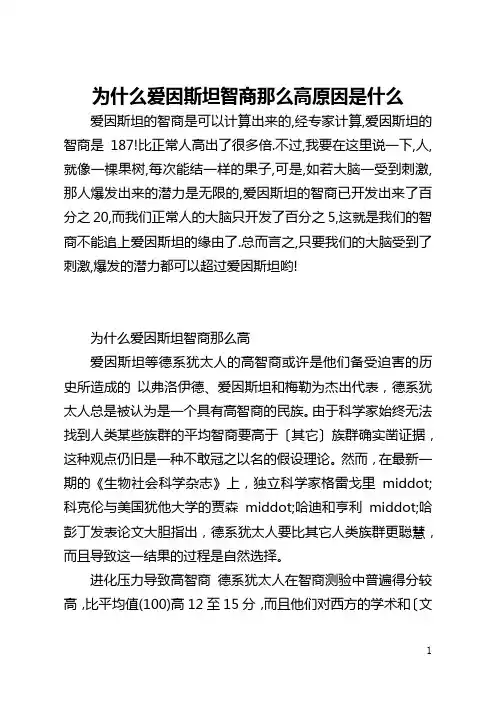 最新为什么爱因斯坦智商那么高?篇一:全球最聪明的10个人爱因斯坦居然排第9全球最聪明的10个人爱因斯坦居然排第9!(组图) 2020-03-09 12:28【字號】特大大中小??????21在世界上最聪明的人TOP10里,就连天才爱因斯坦也只排到第9。