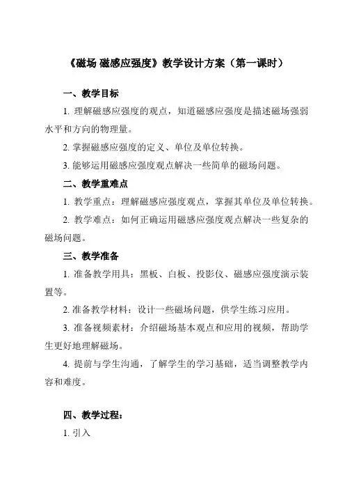 《磁场磁感应强度》教学设计方案(第一课时)一、教学目标1. 理解磁感应强度的观点,知道磁感应强度是描述磁场强弱水平和方向的物理量。