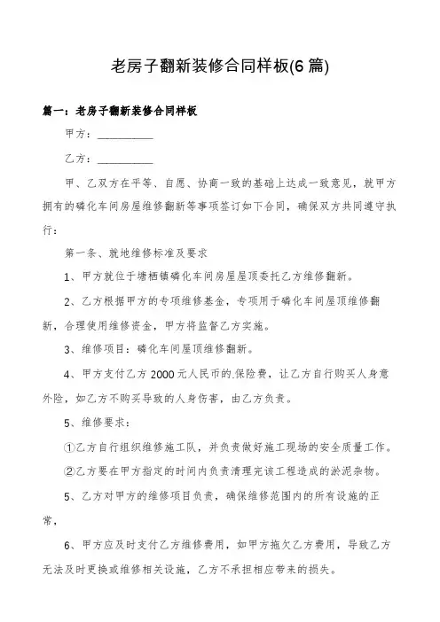 房屋翻修合同6篇篇1房屋翻修合同甲方(出租人):_________乙方(承租人):_________为了明确双方的权利和责任,特订立本翻修合同。