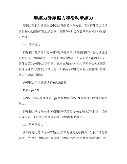 二、滑动摩擦力和静摩擦力的定义滑动摩擦力是指两个物体相对滑动时产生的摩擦力,它的大小与两个物体之间的压力和接触面的粗糙程度有关。