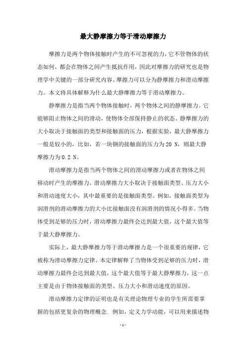 三、滑动摩擦力和最大静摩擦力的关系当一个物体在另一个物体表面上施加的力大于最大静摩擦力时,两个物体之间的摩擦力将变成滑动摩擦力。