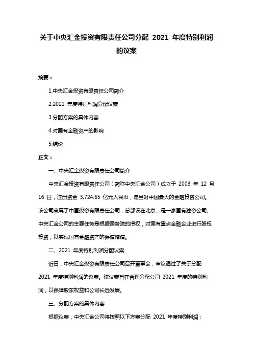 关于中央汇金投资有限责任公司分配2021 年度特别利润的议案摘要:1.中央汇金投资有限责任公司简介2.2021 年度特别利润分配议案3.分配方案的具体内容4.对国有金融资产的影响5.结论正文:一、中央汇金投资有限责任公司简介中央汇金投资有限责任公司(简称中央汇金公司)成立于2003 年12 月16 日,注册资金3,724.65 亿元人民币,是当时中国最大的金融投资公司。