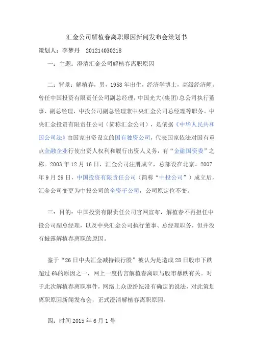 汇金公司解植春离职原因新闻发布会策划书策划人:李梦丹 201214030218一:主题:澄清汇金公司解植春离职原因二:背景:解植春,男,1958年出生,经济学博士,高级经济师。