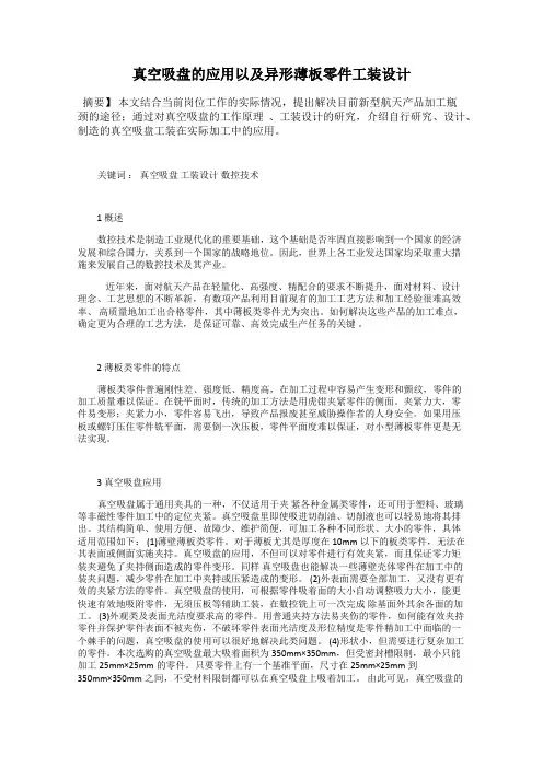 真空吸盘的应用以及异形薄板零件工装设计摘要】本文结合当前岗位工作的实际情况,提出解决目前新型航天产品加工瓶颈的途径;通过对真空吸盘的工作原理、工装设计的研究,介绍自行研究、设计、制造的真空吸盘工装在实际加工中的应用。