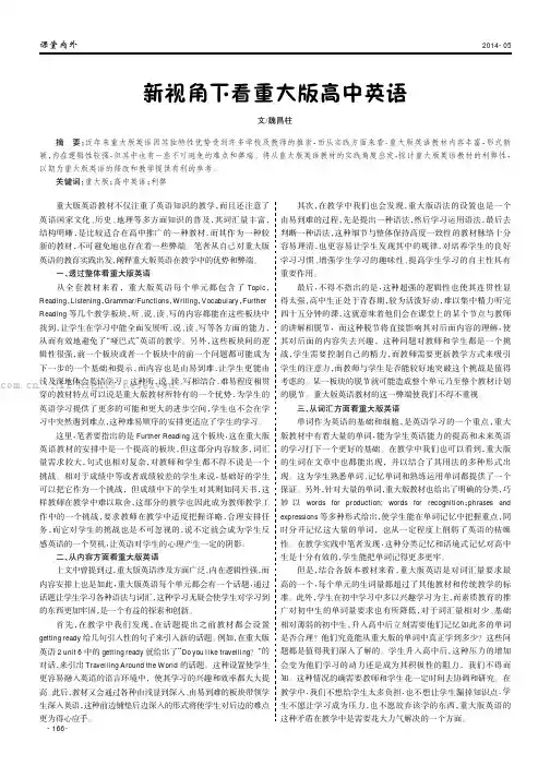 二、从内容方面看重大版英语上文中曾提到过,重大版英语涉及方面广泛,内在逻辑性强,而内容安排上也是如此,重大版英语每个单元都会有一个话题,通过话题让学生学习各种语法与词汇,这种学习无疑会使学生对学习到的东西更加牢固,是一个有益的探索和创新。
