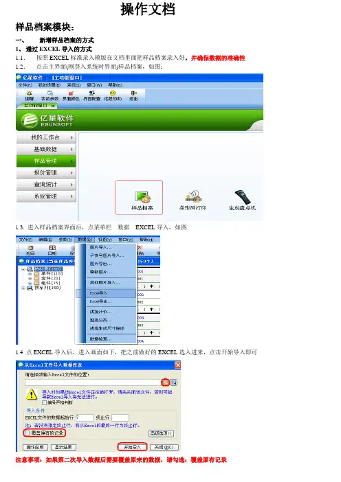 操作文档样品档案模块:一、新增样品档案的方式1、通过EXCEL导入的方式1.1.按照EXCEL标准录入模版在文档里面把样品档案录入好,并确保数据的准确性1.2.点击主界面(刚登入系统时界面)样品档案,如图:1.3. 进入样品档案界面后,点菜单栏---数据---EXCEL导入,如图1.4 点EXCEL导入后,进入画面如下,把之前做好的EXCEL选入进来,点击开始导入即可2. 直接通过系统新增的方式一个个录入进去2.1 进入样品档案界面后,点工具栏的新增按钮,再根据字面意思来完善内容,如图3. 如果要新增一个样品,这个样品的内容与系统已经存在的内容很相似,此时不必重新新增,只需要复制原来的货号,然后再进行简单修改,这样可以提高效率,具体操作:3.1 选中需要复制的货号,点右键—复制为新货号,如图3.2 在弹出的对话框点进行复制即可,如果不要复制的内容,可不要打钩,如图二、如何将图片导入系统1.1建立一个文件夹,把需要导入系统的图片都放进去1.2进入样品档案后,在菜单栏点击数据—图片导入:1.3点击图片导入后,选择您当时建立的存放图片的文件夹,点击将图片导入数据库,如图注意事项:1.样品的图片以货号命名,货号要求不能包含全角字符、空格、中文字符、以及~!@#^_*()|\等内容;2. 图片尽量控制在每张400k以内,以避免存储数据的文件过快增长;3. 在整理图片时建议按照厂家或者材质等独立文件夹整理,以便导入的时候可以进行分类,方便日后查找;在使用软件初期,基础资料的整理工作量相对比较大,建议多人分担一起整理,缩短资料整理周期三、如何打印条形码1.进入系统主界面(刚登入时的界面),点击菜单栏基础数据---样品档案---条形码打印,如图2.进入条形码打印界面后,点货号选择,可点中键盘的shift或ctrl来选择货号,然后点击中间的箭号把货号选择到右边,点击确定即可3.然后点击预览即可打印出来,然后直接将标签贴在带去参加展会的样品上:四、如何批量删除样品档案1.进入样品档案后,在工具栏列表旁边的三角号点一下---选择详细2.在点击详细后,选中shift或ctrl键选择要删除的样品,然后点工具栏的删除五、如何将样品档案的图片导出系统1.进入样品档案后,双击要另存为的图片,系统就会自动弹出图片查看,点另外为按钮,然后选择路径即可将图片导出系统报价管理\送样管理\订单管理模块情景一:客人挑选样品间中现有的样品或者业务员向客人推荐新样需具备的基础资料:客户档案、样品档案中已经建立了所需的资料。