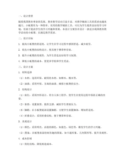 一、设计背景随着我国教育事业的快速发展,学校教学环境日益改善,教学家具作为教学环境的重要组成部分,其设计对教学质量有着重要影响。