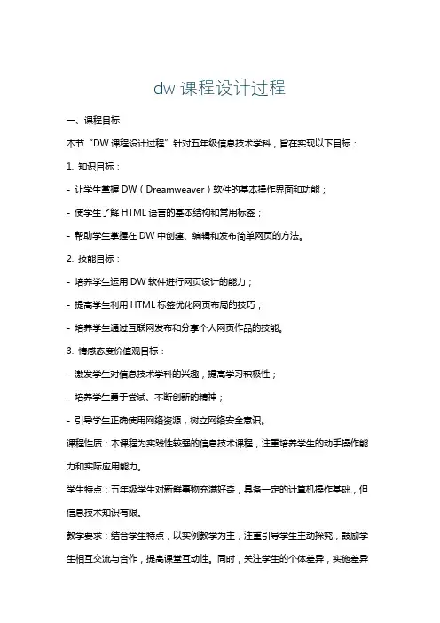 dw课程设计过程一、课程目标本节“DW课程设计过程”针对五年级信息技术学科,旨在实现以下目标:1. 知识目标:- 让学生掌握DW(Dreamweaver)软件的基本操作界面和功能;- 使学生了解HTML语言的基本结构和常用标签;- 帮助学生掌握在DW中创建、编辑和发布简单网页的方法。