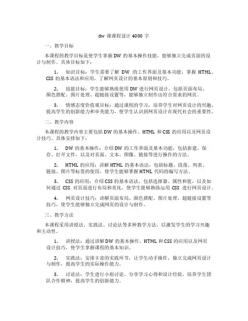 dw课课程设计4000字一、教学目标本课程的教学目标是使学生掌握DW的基本操作技能,能够独立完成页面的设计与制作。
