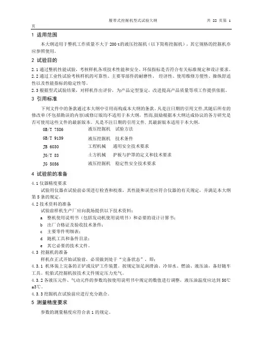 3.2试验样机应具备下列技术条件a、使用维护说明书;b、样机主要技术性能参数(附表);c、试验大纲3.3试验场地a、试验场地应坚实平整,并保证试验样机不下陷,地面坡度不得大于2°;b、场地面积应大于试验样机拆装配套装置的需要,并满足试验样机回转需要。