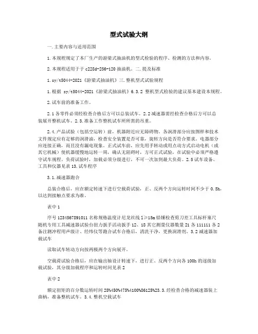 型式试验大纲一.主要内容与适用范围1.本规程规定了本厂生产的游梁式抽油机的型式检验的程序、检测的方法和内容。