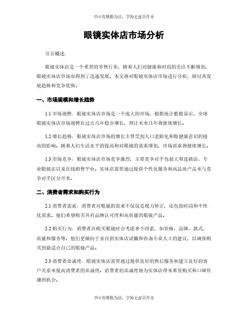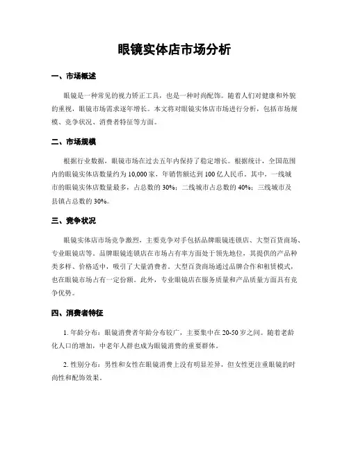 眼镜实体店市场分析一、市场概况眼镜作为一种常见的视力矫正工具和时尚配饰,具有广阔的市场需求。