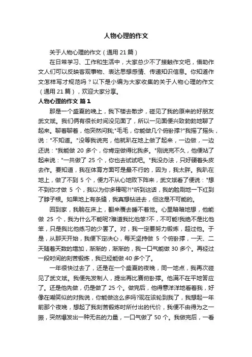 人物心理的作文关于人物心理的作文(通用21篇)在日常学习、工作和生活中,大家总少不了接触作文吧,借助作文人们可以反映客观事物、表达思想感情、传递知识信息。