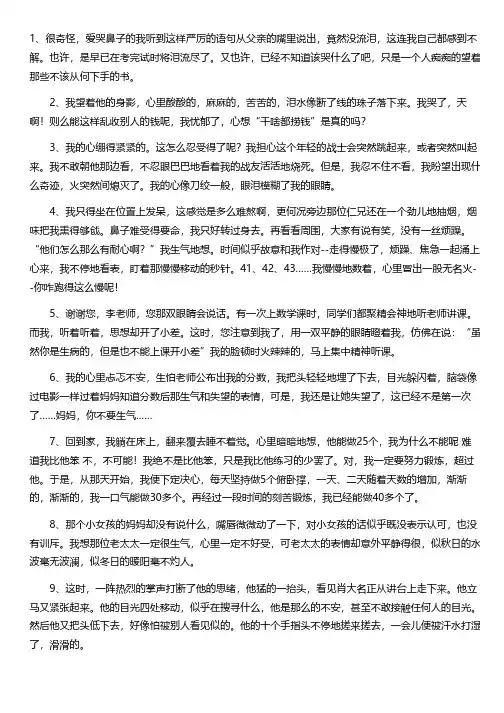 ”一股无名怒火突然爆发:“你眼睛有毛病啊!没看见我在写作业吗!”然而母亲没有走,只是注视着我,母亲眼底的悲哀我尽收眼底,我沉默了,母亲走了……看着只写了一点点的作业,我开始冷静下来,不知为何,竟想起小时候的事情……小时候,母亲总把好吃的留给我,我问她为什么不自己吃,她总是说,“我怕变胖”“我怕蛀牙”“我不能吃这个”“我对这个过敏”。