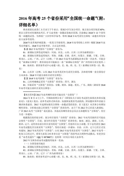 【 - 高中作文】篇一:《2016年高考25省份使用全国卷》2016年高考25省份使用全国卷2016年高考使用全国卷的25个省份为:2014年,使用全国统一命题试卷的省份包括:河南、河北、山西、贵州、甘肃、青海、西藏、黑龙江、吉林、宁夏、内蒙古、新疆、云南、辽宁、广西等15个省(区)。