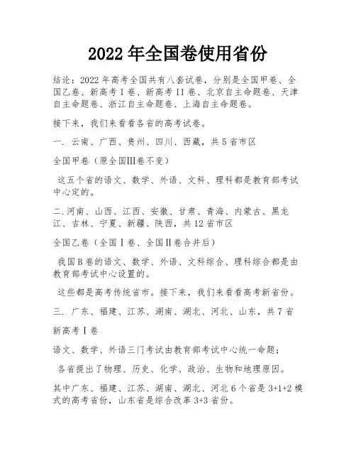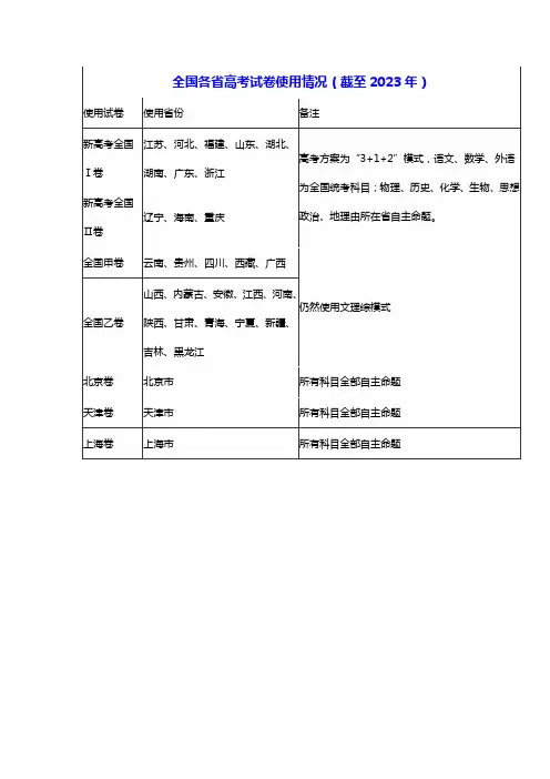 表二全国各省、市、区进入新课改时间一览表使用新课标卷1的省份篇二《2013年高考使用“新课标全国卷”省份(分数线数据对比)》2013年高考使用“新课标全国卷”省份(分数线数据对比)2013年高考全国卷分三种,一种是新课标全国Ⅰ卷(作文关于“经验与勇气”的省份)、一种是新课标全国Ⅱ卷(作文材料关于“同学间的人际关系”的省份)、一种是广西仍在使用的大纲版全国卷。