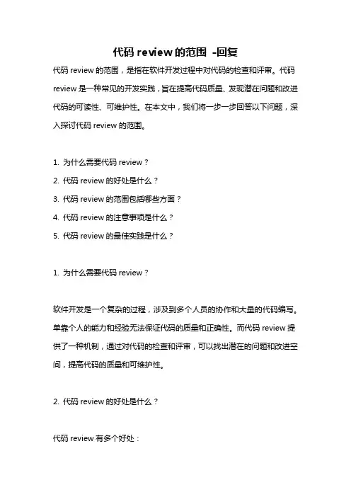 3. 代码review的范围包括哪些方面?代码review的范围通常包括以下几个方面:a. 代码规范和命名:检查代码是否符合项目的代码规范和命名约定。