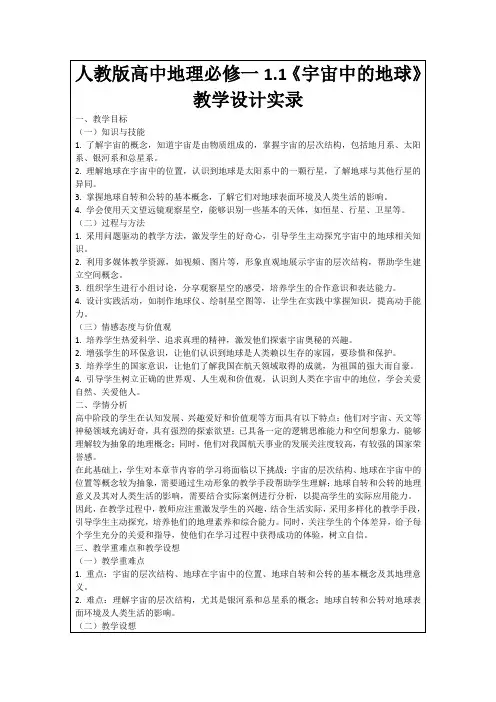 三、教学方法讲授法、讨论法、直观演示法四、教学过程1、导入新课通过播放一段关于宇宙星空的视频,引导学生思考地球在宇宙中的位置,从而引出本节课的主题——宇宙中的地球。