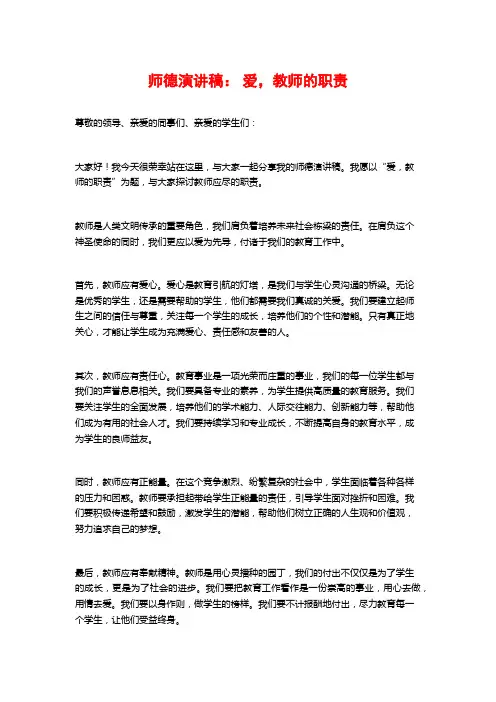 师德演讲:爱,教师的职责尊敬的各位领导、各位老师、亲爱的同学们:大家好!今天我想和大家分享的主题是师德演讲:爱,教师的职责。