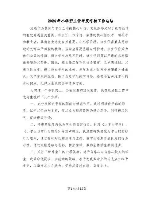 2024年班主任年度个人考核总结怎么写6篇篇1在过去的一年里,我作为一名班主任,始终坚持以学校大局为重,以学生为中心,认真履行职责,努力完成各项工作。