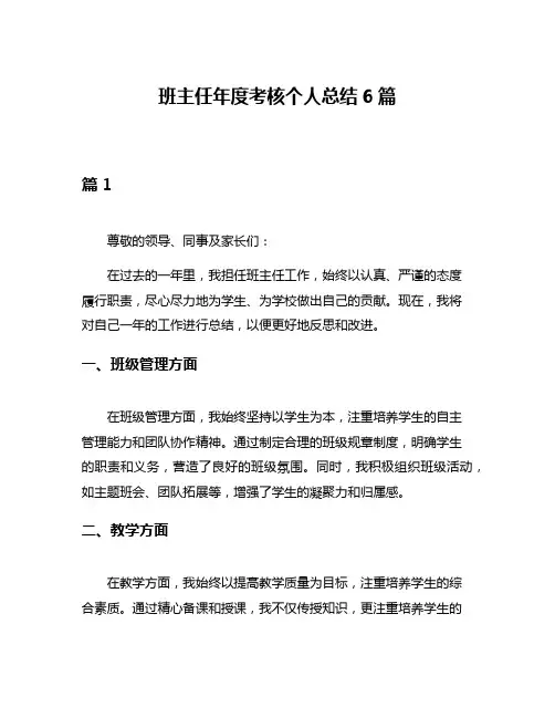 班主任年度考核个人总结6篇篇1尊敬的领导、同事及家长们:在过去的一年里,我担任班主任工作,始终以认真、严谨的态度履行职责,尽心尽力地为学生、为学校做出自己的贡献。