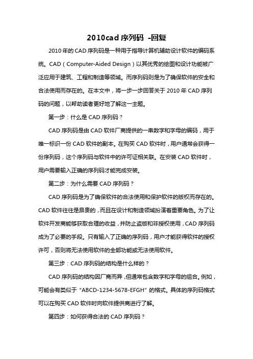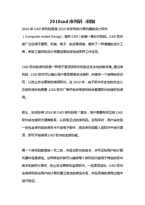 2010cad序列码-回复2010年CAD序列码是指2010年发布的计算机辅助设计软件(Computer-Aided Design,简称CAD)的唯一身份识别码。