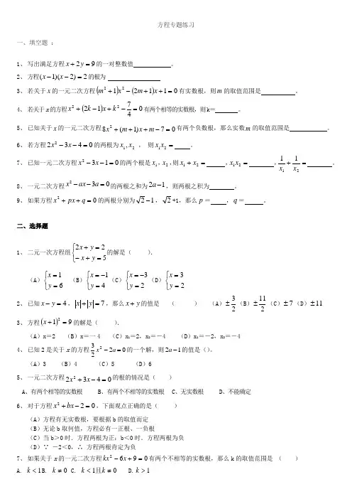 (A )3 (B )4 (C )5 (D )65、 一元二次方程04322=-+x x 的根的情况是( )A 、有两个相等的实数根B 、有两个不相等的实数根C 、无实数根D 、不能确定6、 对于方程022=-+bx x ,下面观点正确的是( )(A )方程有无实数根,要根据b 的取值而定(B )无论b 取何值,方程必有一正根、一负根(C )当b >0时.方程两根为正:b <0时.方程两根为负(D )∵ -2<0,∴ 方程两根肯定为负7、 如果关于x 的一元二次方程kx x 2690-+=有两个不相等的实数根,那么k 的取值范围是 ( )A. k <1B. k ≠0C. k k <≠10且D.k >18、 设1x ,2x 是关于x 的方程02=++q px x 的两根,11+x ,12+x 是关于x 的方程02=++p qx x 的两根,则p ,q 的值分别等于 ( )(A )1,-3 (B )1,3 (C )-1,-3 (D )-1,3 9、 已知012=-+αα,012=-+ββ,且α≠β,则βααβ++的值为( ). (A )2 (B )一2 (C )一1 (D )010、 已知α、β满足α+β=5且αβ=6,以αβ为两根的一元二次方程是( )(A )0652=++x x (B )0652=+-x x(C )0652=--x x (D )0652=-+x x11、 如果将方程32)2(22222=+++++x x x x 变形为32=+y y ,下列换元正确的是( ) A 、y x =+212 B 、y x x =+222 C 、y x x =+22 D 、y x x =++222 12、 已知实数x 满足x 2+21x + x+x 1 =0,那么x+x 1的值为 ( ) A 、1或-2 B 、-1或2 C 、1 D 、-213、 已知x 为实数,且()033322=+-+x x x x ,那么x x 32+的值为( ) (A )1 (B )-3或1 (C )3 (D )-1或314、 下面是李刚同学在测验中解答的填空题,其中答对的是A .若42=x ,则x=2 B .方程()1212-=-x x x 的解为x=1 C .若022=++k x x 的两根的倒数和等于4,则21-=k D .若分式 1232-+-x x x 的值为零,则x=1,2 15、 方程组⎩⎨⎧=-++=-+032012y x x y x 的解是( )。