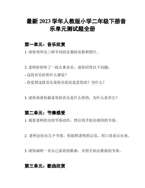 新人教版二年级音乐下册期末试卷及答案选择题1. 以下哪个不属于弦乐器?A. 小提琴B. 钢琴C. 大提琴答案:B2. 西方音乐中,一般都是用什么作为乐曲的基础节拍?A. 二拍子B. 三拍子C. 四拍子答案:C3. “动物世界”是谁创作的音乐?A. 田汉B. 聂耳C. 麦兜答案:A填空题4. “双手捧着小鼓,轻轻地打着嗒,小兔子眼睛好,小兔子长耳朵”,这是哪首儿歌的歌词:____________答案:小兔子乖乖5. 舞蹈《清明上河图》让我们回到了哪个朝代的生活场景中:____________答案:北宋6. 以下不是西方乐器的是:____________答案:二胡简答题7. 什么是合唱?请简述并至少列举一部合唱作品。